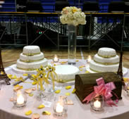 Centros de mesa en flores y rosas o cilindros de cristal decorados Arreglo floral para mesa de ponqué Decoración de cofre, pala y sierra, Entrada con antorchas, velas en cristales y pétalos